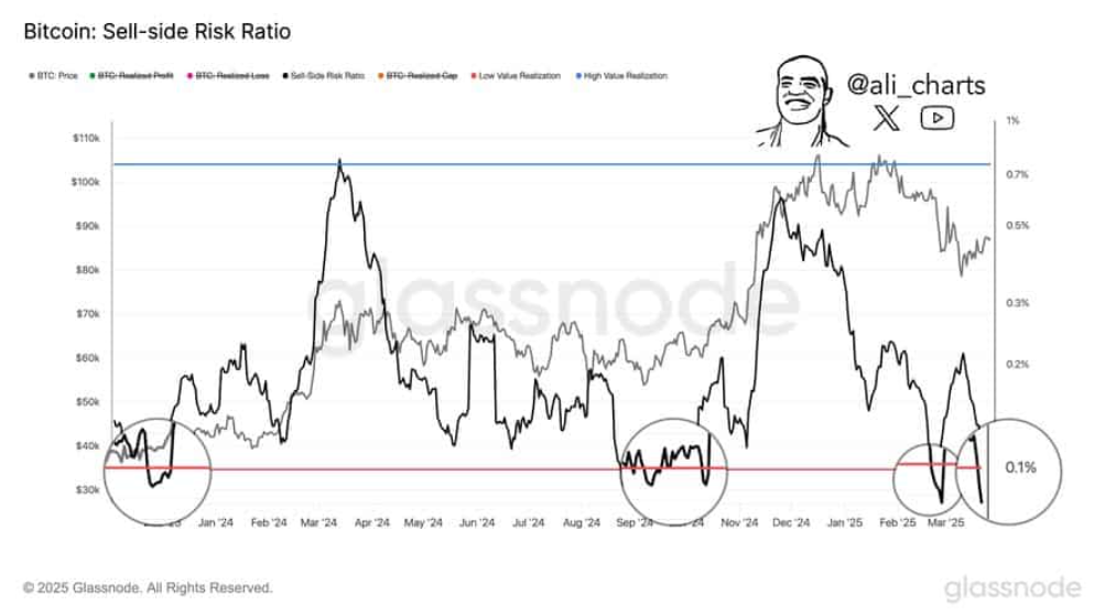 تاريخياً، عندما ينخفض هذا النسبة إلى 0.1% أو أقل، فإنه غالبًا ما يشير إلى بداية ارتفاع قوي. حاليًا، نسبة البيع الصافي عند 0.086%، مما يشير إلى أن بيتكوين قد تستأنف ارتفاعها قريبًا.