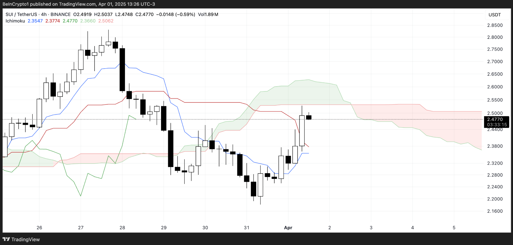 يُظهر مخطط سحابة إيشيموكو لـ SUI محاولة اختراق حيث ارتفعت الأسعار بشكل حاد والآن تتأرجح عند حافة السحابة.