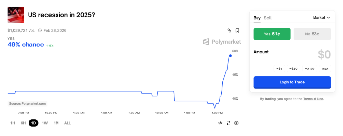 ! تتوقع بوليماركت حاليًا احتمالًا قريبًا من 50% بأن الولايات المتحدة ستدخل في ركود اقتصادي هذا العام، حيث تفوقت الضرائب المفروضة على الواردات من قبل ترامب وفقًا ليوم تفسير ترامب على التوقعات. كل من سوق العملات المشفرة والسوق التقليدي يتجهان نحو الانخفاض، وأصبح المطورون الاقتصاديون غير مستقرين.