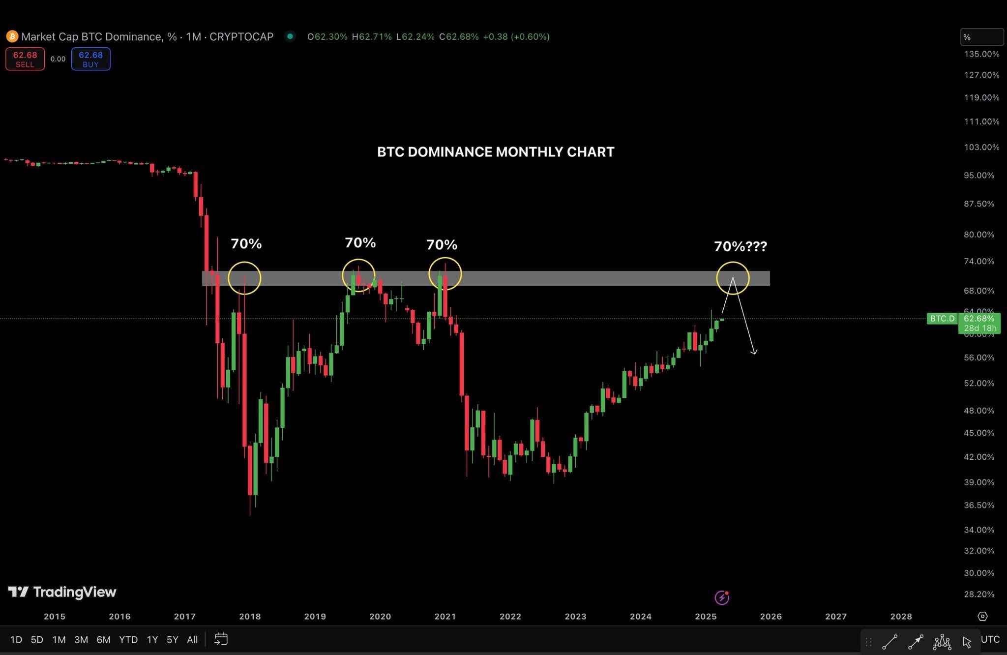 حاليًا، لا يزال BTC.D فوق 60% دون أي علامات على الضعف. تعزز توقعات Ash Crypto الثقة في أن الربعين الثاني والثالث من عام 2025 قد يشهدان بداية ارتفاع كبير في أسعار الألتكوين.