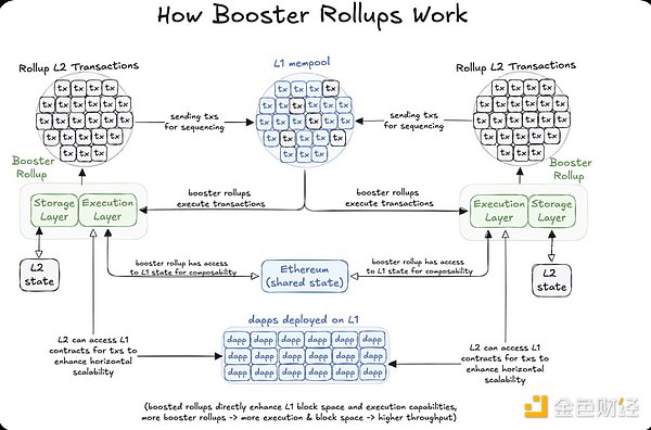 تتعامل Booster Rollups مع المعاملات بطريقة مشابهة لتنفيذها على L1، حيث يمكنها الوصول إلى حالة L1 ولكن لديها تخزين مستقل، مما يوسع التنفيذ والتخزين إلى L2. كل L2 يمدد مساحة الكتلة الخاصة بـ L1، مما يوزع معالجة المعاملات وتخزين البيانات على نطاق أوسع.