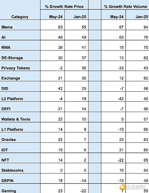 تظهر البيانات أن memecoin والرموز المميزة المرتبطة ب الذكاء الاصطناعي ورموز RWA هي قادة النمو المبكر. وتشمل الملاحظات الأخرى زيادة في حجم المعاملات عبر جميع الفئات ، وهو أمر شائع في الفترات التي يبدو فيها أن الاهتمام والمشاركة في مشاريع blockchain تزداد كل أربع سنوات. قد لا تشهد مشاريع DePIN نموا كبيرا في بداية الدورة ، على الرغم من أن مشروعا مبتكرا واحدا أو أكثر قد يحقق بعض الاختراقات. لقد تجاوز نمو مشاريع المستوى 2 نمو مشاريع المستوى 1 ، أو استوعب معظم النمو الذي ستشهده الأخيرة. يتم عرض نتائج يناير 2025 في شكل رسم بياني أدناه.