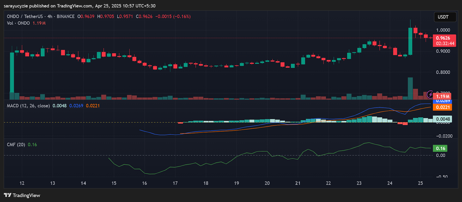 ! *مخطط ONDO (Source: TradingView)*يعتبر تقاطع خط MACD للأصل فوق خط الإشارة صعوديا، مما يشير إلى الزخم الإيجابي وارتفاع الأسعار. تشير قراءة CMF ل ONDO عند 0.16 إلى ضغط الشراء وعلامات التراكم داخل السوق