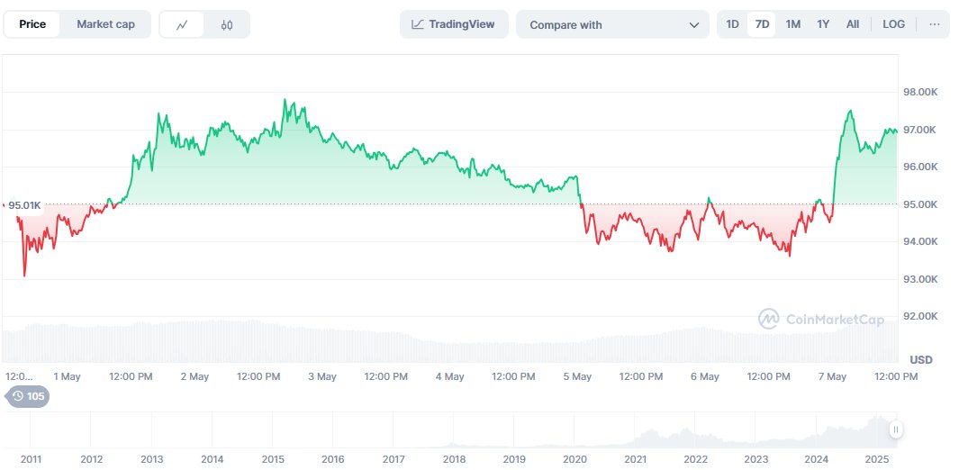 بيتكوين الآن يشهد نموًا هائلًا مقارنةً بالوضع الذي كان فيه سابقًا. في أبريل، على سبيل المثال، كانت بيتكوين تدور حول نطاق سعر 80K إلى 95K دولار، مع تقلبات طبيعية. انطلقت الأمور في بداية مايو، عندما ارتفعت بيتكوين وتجاوزت نقطة سعر 97K دولار، قبل أن تتأثر بالتقلبات مرة أخرى وتسقط دونها. بالأمس، تسلقت مرة أخرى إلى ما يتجاوز علامة 97K، مما يشير إلى موقف قوي لمزيد من النمو والنجاح. وهذا يمثل زيادة بنسبة 27.2% على أساس شهري في السعر، وزيادة بنسبة 2.90% في القيمة السوقية يوميًا.