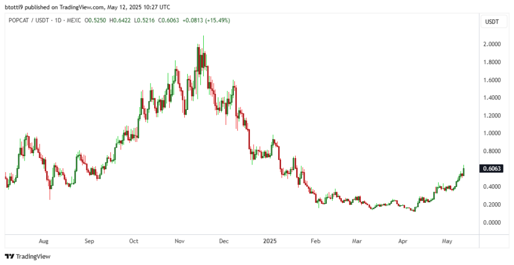 الزيادة من 0.24 دولار إلى ارتفاعات 0.62 دولار في وقت كتابة هذه السطور في 12 مايو 2025، تضع Popcat بين أفضل العملات أداءً في أفضل 500 عملة من حيث القيمة السوقية.