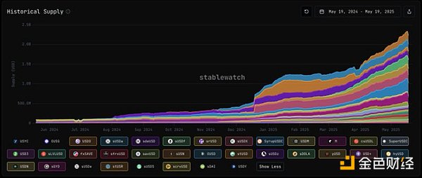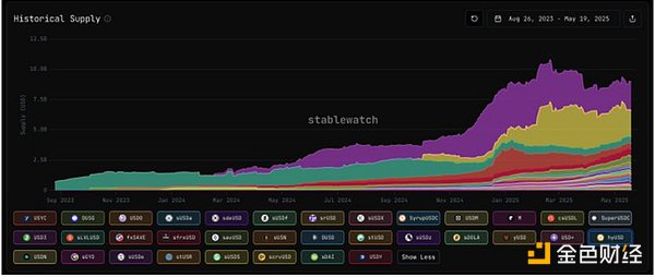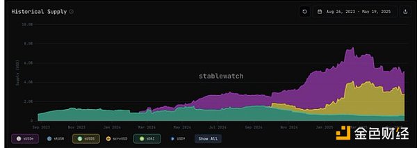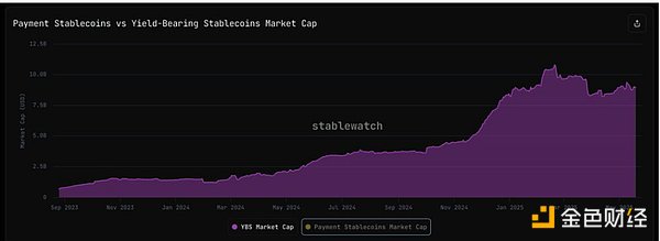 في أقل من عامين، زادت الإمدادات الإجمالية من العملات المستقرة المدرة للعائد بمقدار 13 مرة، من 666 مليون دولار في أغسطس 2023 إلى 8.98 مليار دولار في مايو 2025. وقد وصلت إلى ذروة تاريخية بلغت 10.8 مليار دولار في فبراير من هذا العام، ثم استقرت بعدها.
