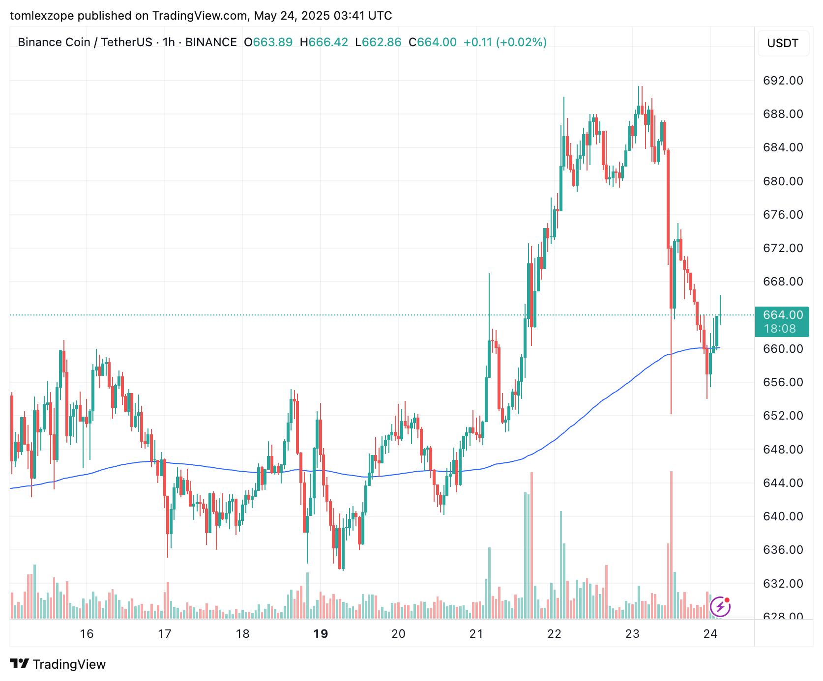 في وقت كتابة هذه السطور، يبلغ سعر BNB حوالي 670 دولارًا، مما يعكس انخفاضًا بنسبة 2% في آخر 24 ساعة. بدأت العملة البديلة يوم الجمعة في صعود، مستمتعة بارتفاع سريع نحو علامة 690 دولارًا في الساعات الأولى من اليوم.