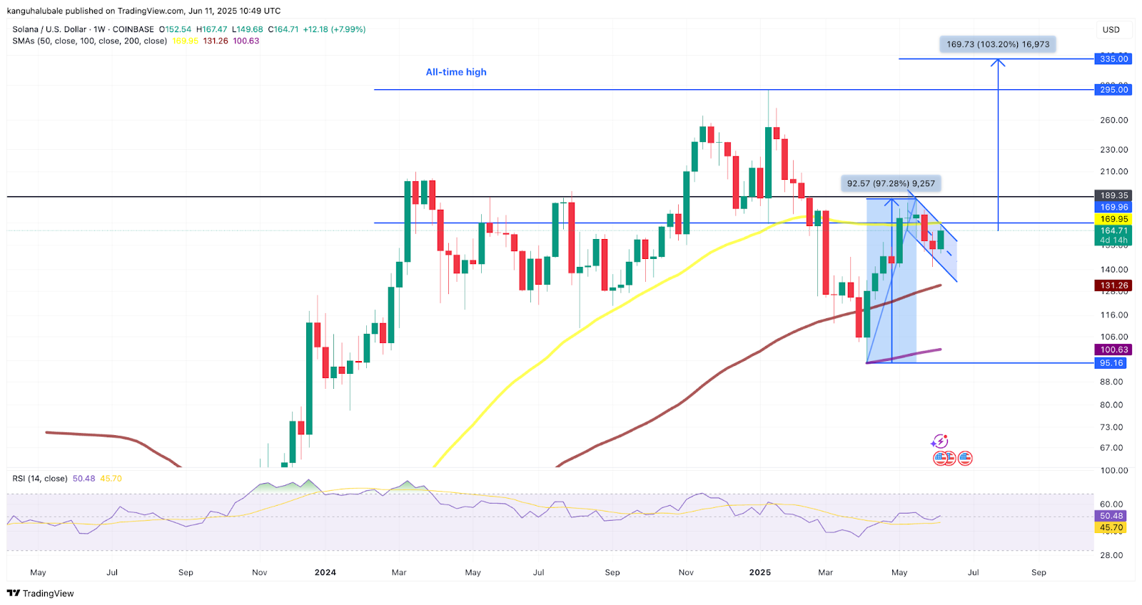 على الإطار الزمني الأسبوعي ، يشكل سعر SOL نمط “العلم الصعودي” (bull flag) - وهو نمط صعودي يظهر عندما يصحح السعر مؤقتا في نطاق هبوطي بعد ارتفاع سابق قوي.