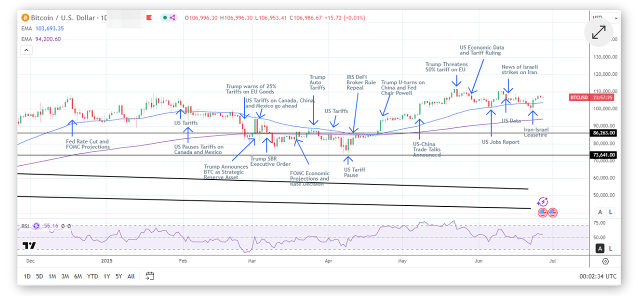 سيناريو هبوطي: انهيار اتفاق وقف إطلاق النار بين إيران وإسرائيل، إخفاق التشريعات، تصاعد الحرب التجارية الأمريكية، تفاقم التضخم في الولايات المتحدة، وسحب الأموال من ETFs. قد تؤدي هذه العوامل مجتمعة إلى انخفاض BTC نحو متوسط الحركة الأسي لمدة 50 يومًا (EMA)، وكسر مستوى 100,000 دولار. سيناريو صعودي: تم التوصل إلى اتفاق لوقف إطلاق النار بين إيران وإسرائيل، دعم الحزبين لقانون العملات المشفرة، انخفاض مخاطر الرسوم الجمركية وتدفق الأموال إلى صناديق ETF. في هذه الحالة، قد يعود BTC إلى أعلى مستوى تاريخي له عند 111,917 دولار.