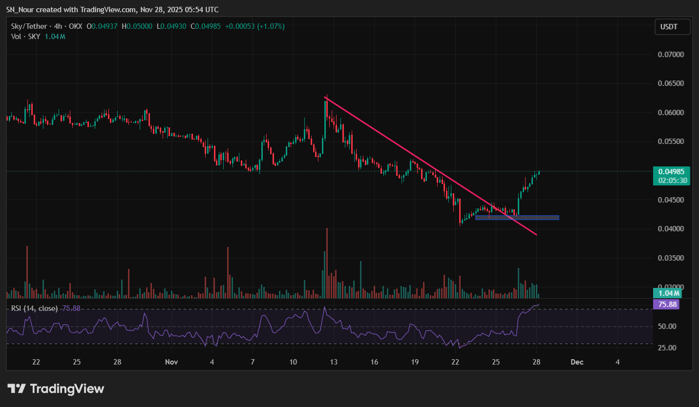 هذه الخطوة أثارت الآمال في أن SKY قد تكون قد شكلت القاع، في ظل ظهور إشارات ارتداد خفيفة في سوق العملات البديلة في الأيام الأخيرة. إذا استمر الزخم في الاستقرار، فإن SKY لديها القدرة تمامًا على التوجه نحو مستوى 0,0620 USD، بل وحتى أعلى في السيناريو الإيجابي.