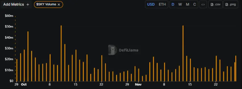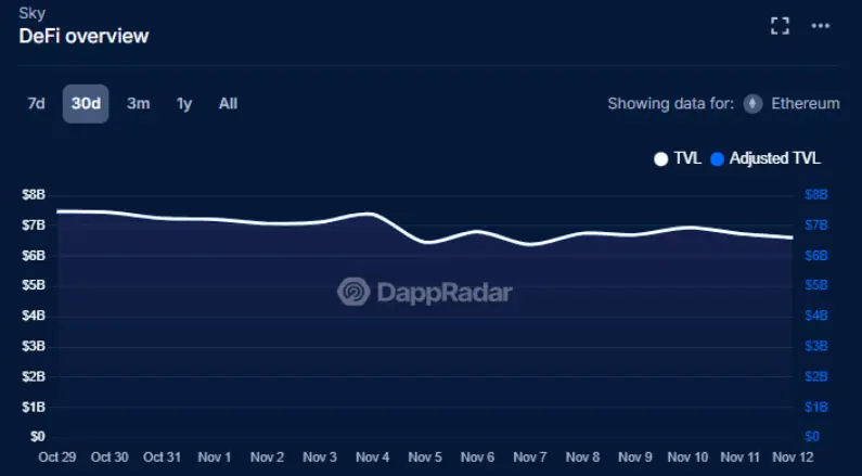 المصدر: TradingViewمن الجدير بالذكر أنه على عكس توقعات السوق الصاعدة، فإن إجمالي القيمة المقفلة (TVL) في نظام SKY البيئي آخذ في التناقص. خلال 30 يومًا الماضية، انخفضت القيمة المقفلة من 7.7 مليار USD إلى 6.6 مليار USD، مما قد يصبح عقبة أمام نمو السعر.