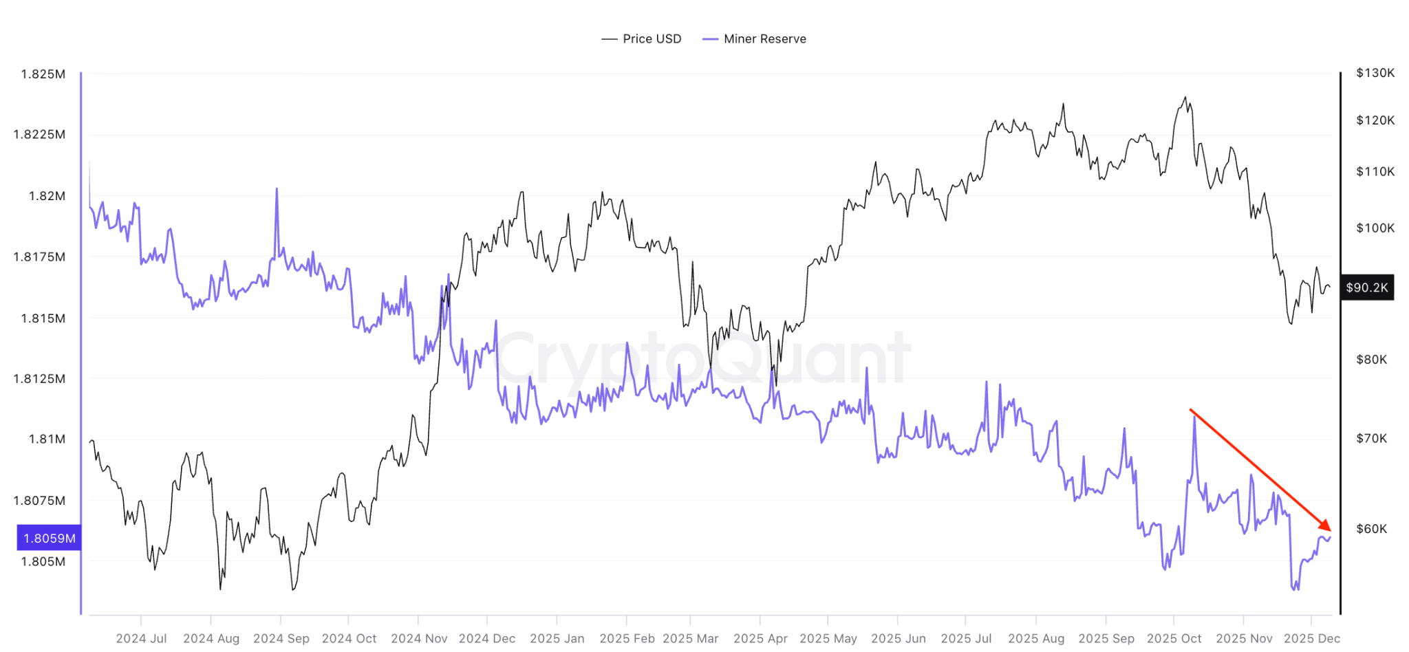 على الرغم من أن احتياطيات البيتكوين لدى المعدنين بقيت شبه ثابتة في عام 2025، إلا أن نشاط البيع ظل مرتفعا منذ بداية أكتوبر.