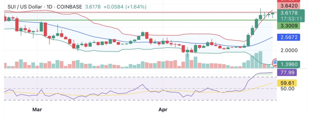 تحليل سعر SUI. الائتمان: crypto.news بالإضافة إلى ذلك، تشير جميع المتوسطات المتحركة المقدرة إلى الشراء. إذا استمر ضغط الشراء وبقي SUI فوق 3.60 دولار، فقد يحاول التحرك نحو 4.00 دولار، وهو مستوى نفسي قد يجذب المزيد من متداولي الزخم.