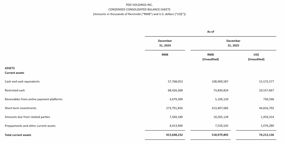على الرغم من انكماش الأرباح، لا تزال ميزانية 拼多多 العمومية تحافظ على متانة. واعتبارًا من 31 ديسمبر 2025، بلغ إجمالي النقد والنقد المكافئ والاستثمارات قصيرة الأجل نحو 422.3B元(حوالي 60.4B美元)، مقارنةً بـ331.6B元 بنهاية 2024، بزيادة تقارب 90.7B元، بما يوفر قاعدة تمويلية كافية لعمليات ضخ استراتيجي واسعة النطاق لاحقًا.