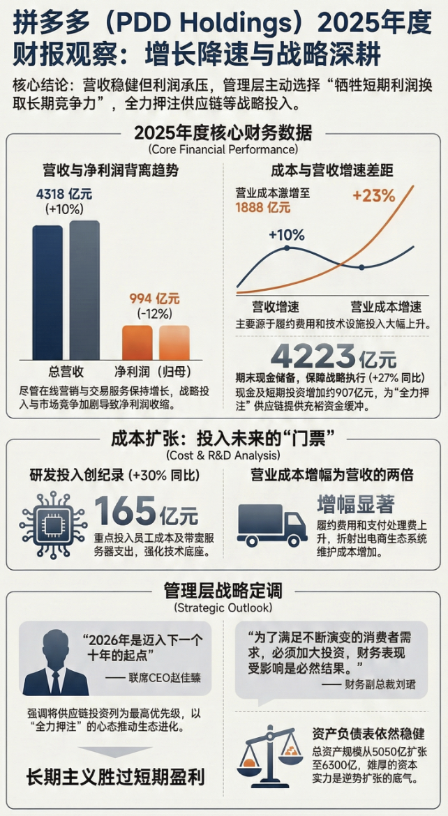 拼多多公布的2025年全年财报显示,营收保持增长但利润出现明显收缩,折射出国内电商竞争加剧与持续加大投入之间的结构性张力。公司管理层明确表示,未来将以“全力押注”的姿态加大供应链投资,并直接警示这将对财务表现带来压力。