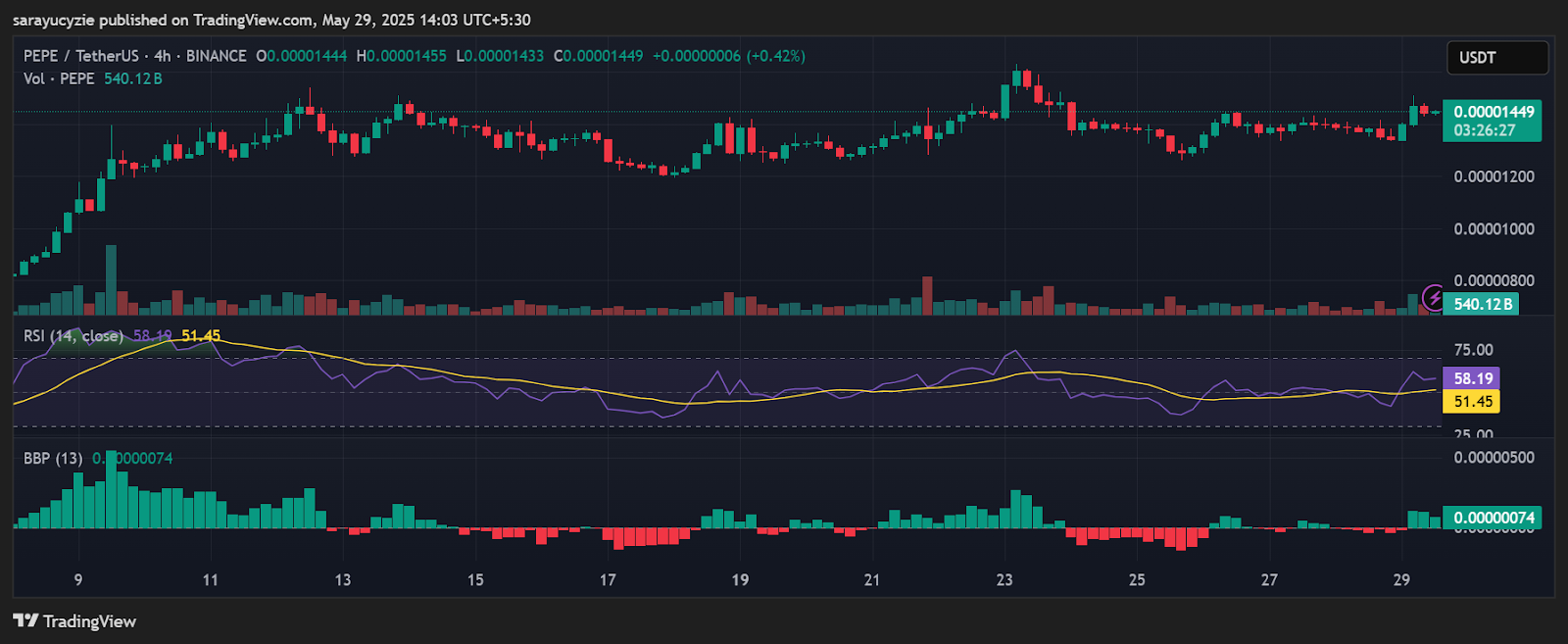 ! *PEPE-Chart (Source: TradingView)*Darüber hinaus ist der anhaltende Markt der Meme-Münze moderat bullisch, und es besteht noch Raum für eine Aufwärtsbewegung, bevor ein potenzieller Widerstand erreicht wird, da der tägliche Relative-Stärke-Index (RSI) bei 58,19 liegt. Außerdem zeigt der Bull Bear Power (BBP)-Wert von 0,00000074 einen sehr leichten Aufwärtsdruck.