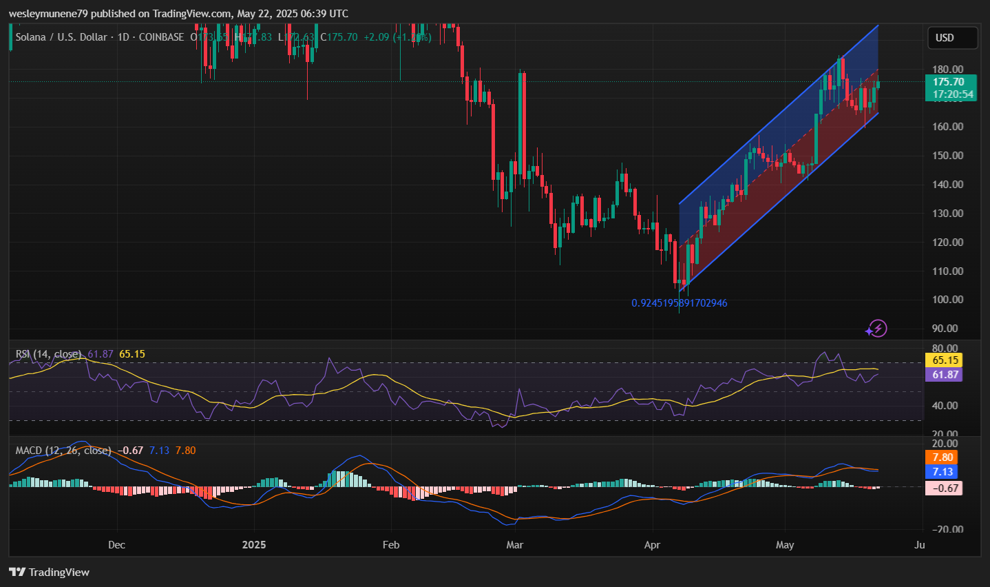 La criptomoneda Solana se ha destacado en el mercado, ya que muchos otros activos digitales han mostrado volatilidad, destacando el fuerte impulso alcista en las últimas semanas. De acuerdo con la acción actual del precio, el precio ha respetado constantemente un canal de regresión alcista desde principios de abril de 2025, comenzando alrededor de 100 dólares y subiendo constantemente hasta su nivel actual en 175.70 dólares. Este canal refleja una tendencia alcista bien definida, con la acción del precio formando máximos y mínimos más altos a lo largo del camino.