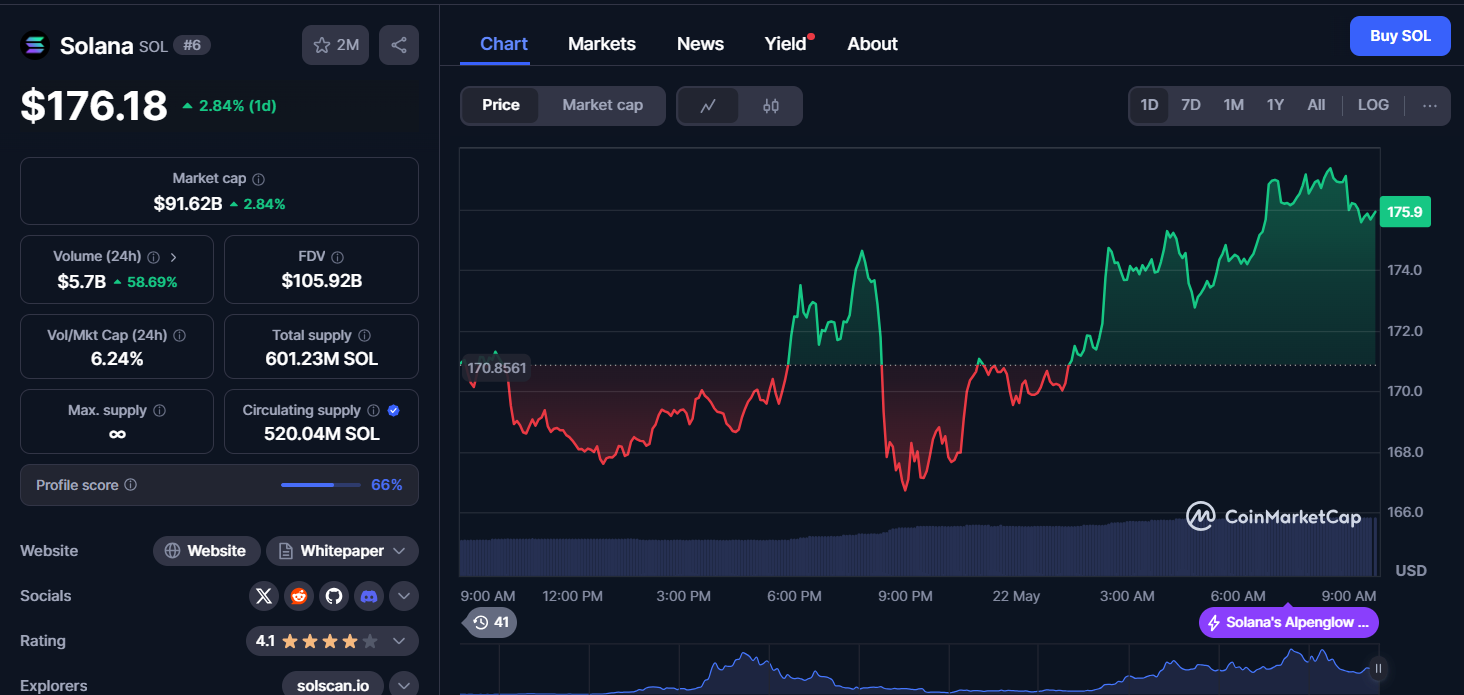 Siguiendo el movimiento más amplio del mercado a lo largo del tiempo, los datos de CoinMarketCap indican que los alcistas han estado bajo control. Hasta la fecha, los datos indican que durante la sesión de negociación asiática, el activo abrió su mercado con un valor de precio de $169.93, marcando su mínimo durante la sesión. Actualmente, Solana se está negociando a $176.18, lo que refleja un aumento del 2.84% en las últimas 24 horas, mientras que la capitalización de mercado se sitúa en $91.62 mil millones, con una valoración totalmente diluida de $105.92 mil millones.