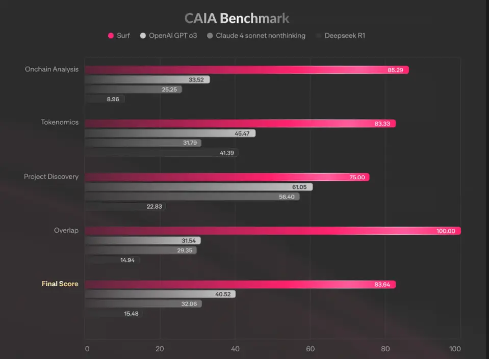 En cuanto a rendimiento, la versión 1.0 de Surf destacó en la prueba de referencia CAIA. Esta prueba, desarrollada en colaboración entre Surf y la Universidad de Princeton, evalúa la capacidad de modelos de IA para realizar tareas de analistas humanos de nivel inicial. Los resultados muestran que Surf es 4 veces más efectivo que modelos como ChatGPT y Grok en tareas específicas de criptomonedas, ofreciendo citas más concretas y menos errores.