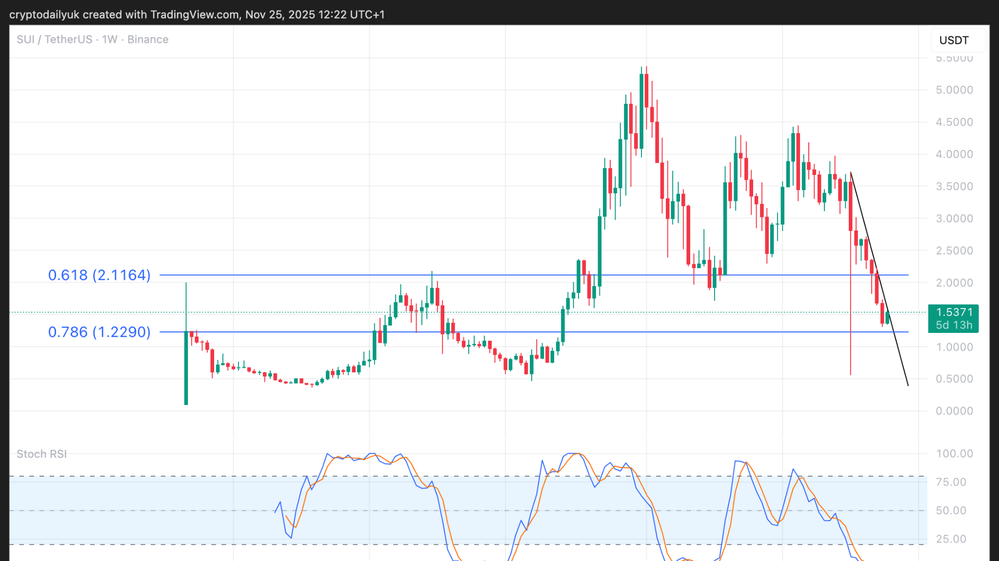 Sin mirar otros gráficos de marco temporal, el marco temporal semanal para $SUI lo dice todo. El precio cayó un 70% desde el máximo pivotante, y un 87% si se cuenta la mecha de la vela del 10 de octubre. Esta es una gran corrección en esta etapa del mercado alcista, y sin duda debe dejar el camino despejado para un repunte hacia arriba.