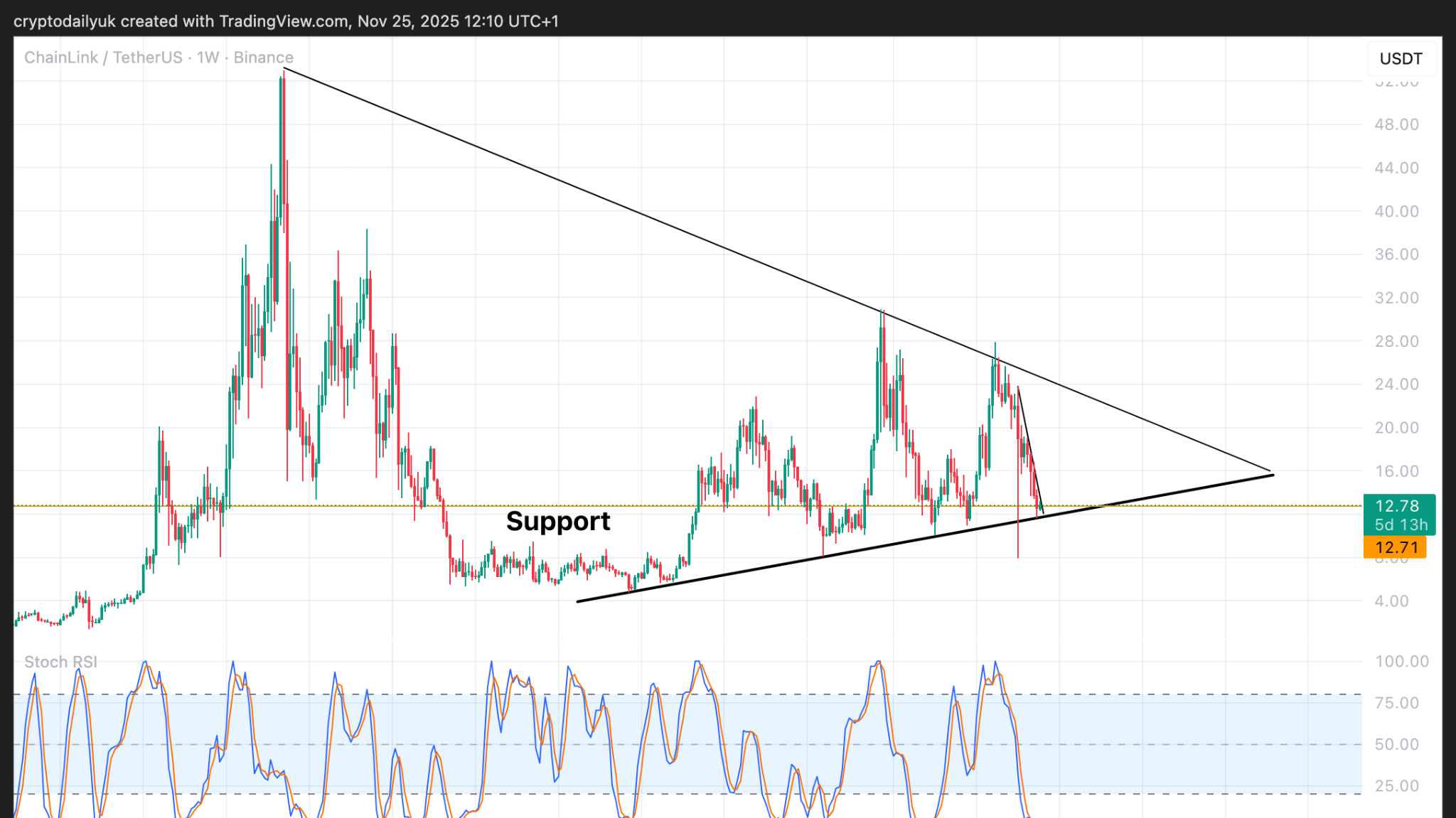 El gráfico diario para $LINK muestra que una ruptura es inminente, en una dirección o en la otra. Por debajo del precio de $LINK hay una línea de tendencia importante que se ha mantenido desde junio de 2023. El soporte horizontal también es un nivel importante. Con el precio apenas por debajo de una línea de tendencia descendente, no pasará mucho tiempo antes de que ocurra una ruptura.