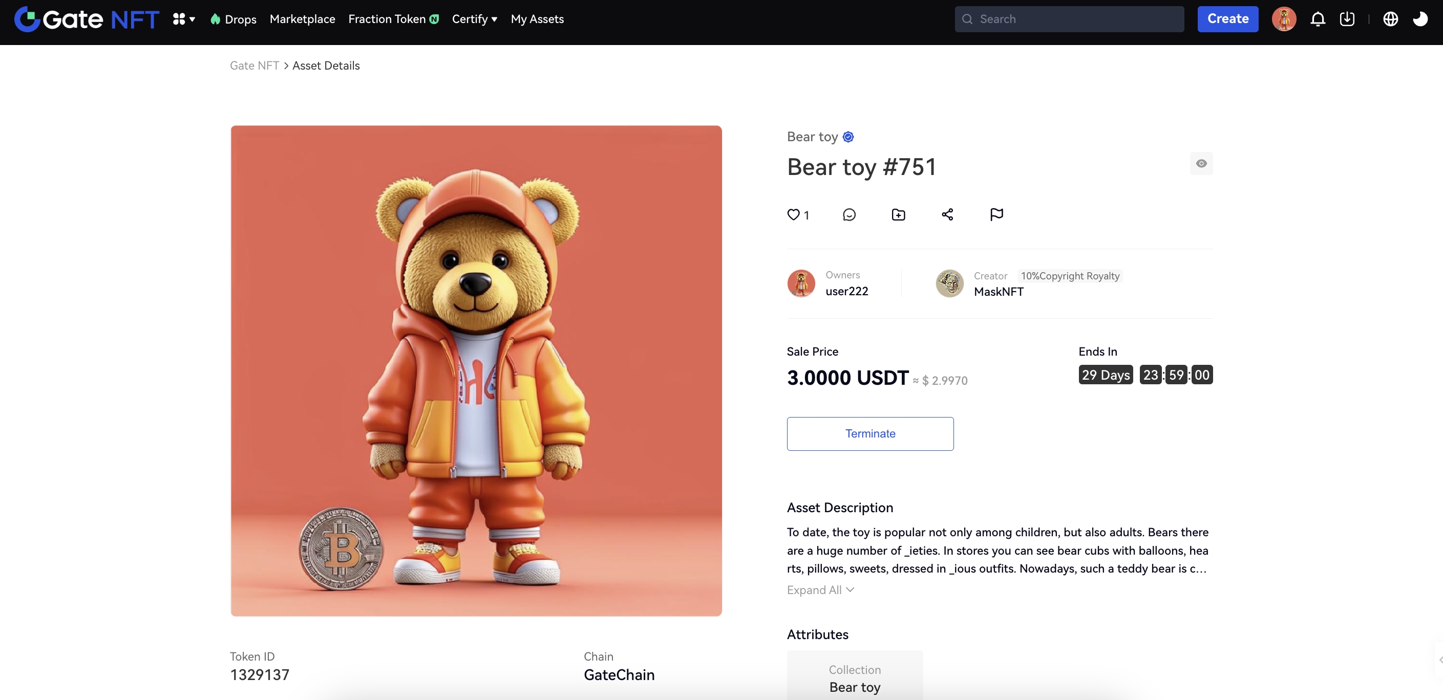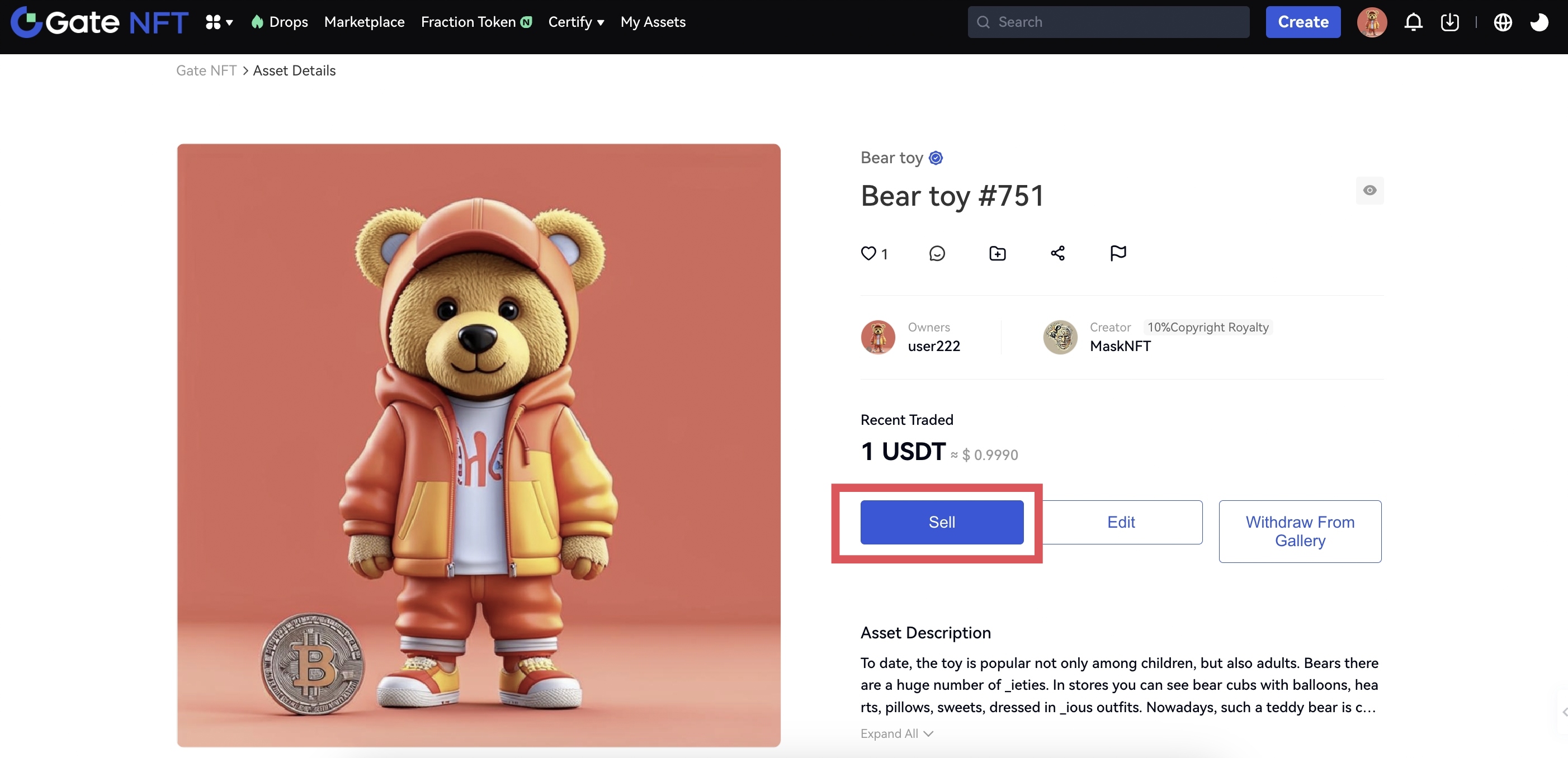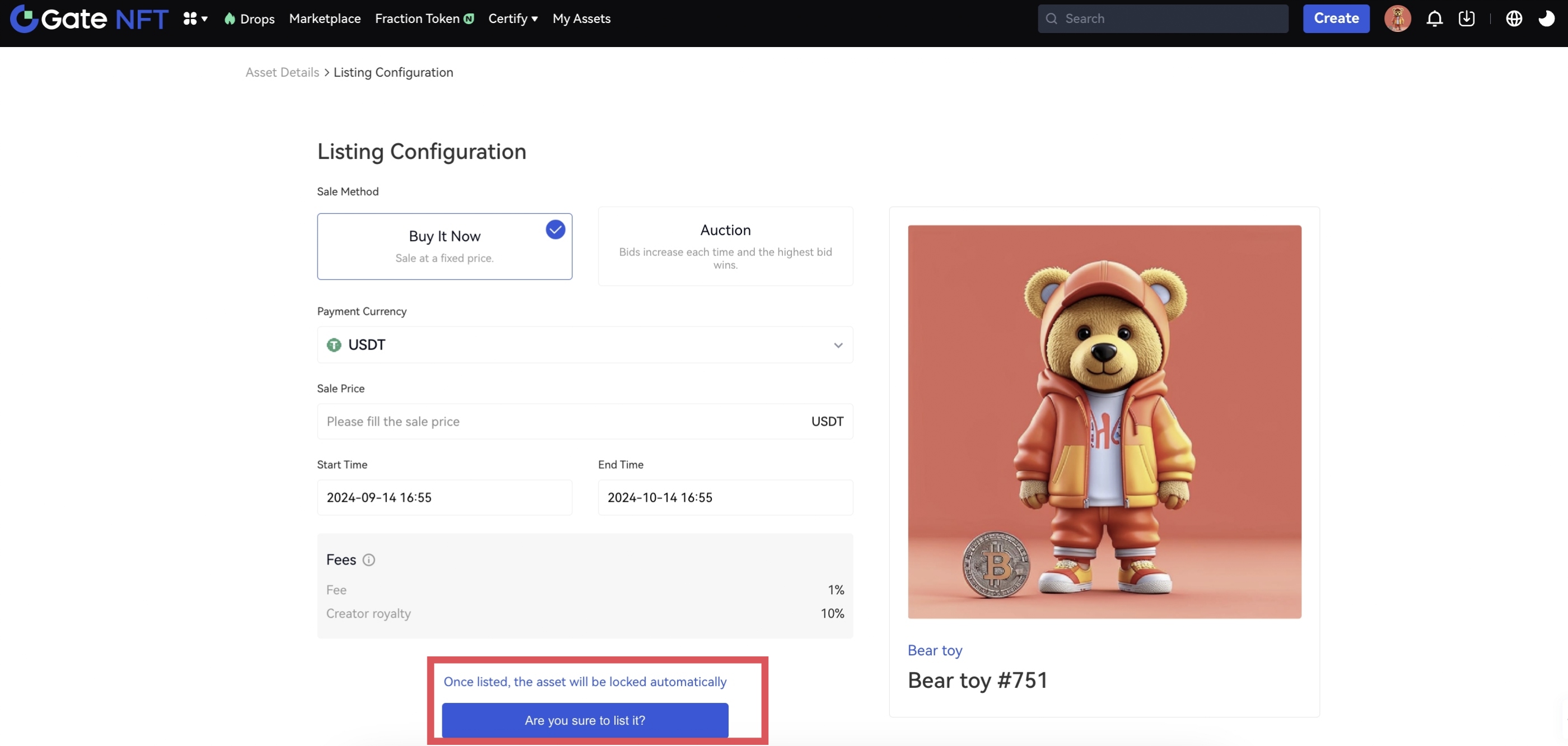Vous pouvez vendre vos NFT sur Gate NFT à un prix fixe ou par le biais d'une vente aux enchères, et différentes devises sont prises en charge pour payer le prix.