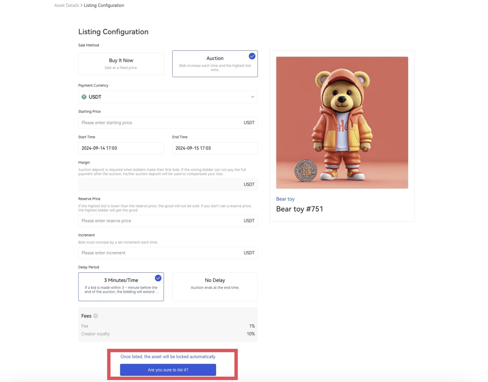 Accédez à la page de configuration de la mise en vente du bien NFT, cliquez sur l'option Enchères, choisissez la devise de paiement que vous préférez dans la liste déroulante, saisissez le prix de départ et définissez les heures de mise en vente et de retrait. Définissez le prix de réserve, saisissez l'incrément de prix, sélectionnez la période de prolongation et cliquez sur le bouton "Are you sure to list it ?" pour inscrire le bien ;