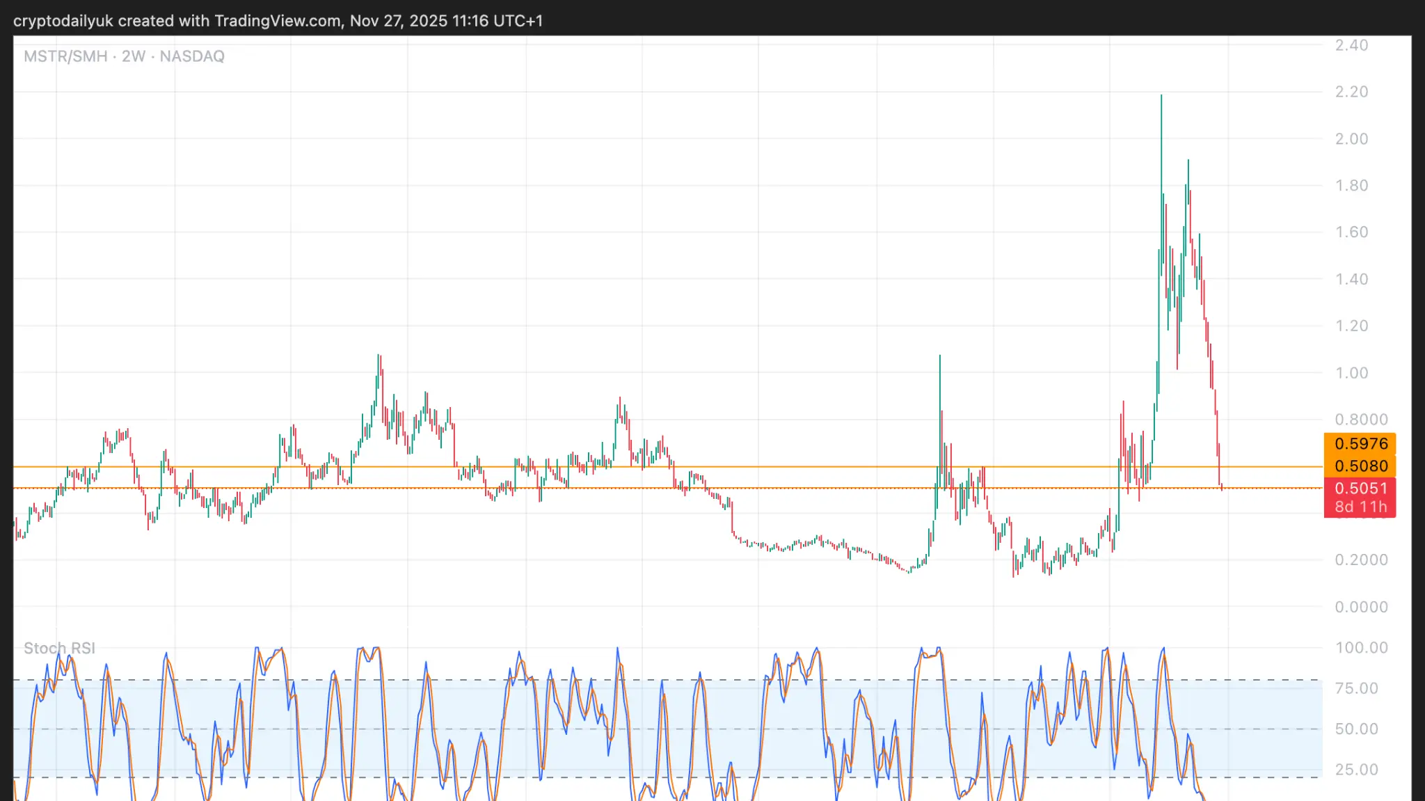 Contraster le prix de MSTR avec SMH donne le graphique ci-dessus.