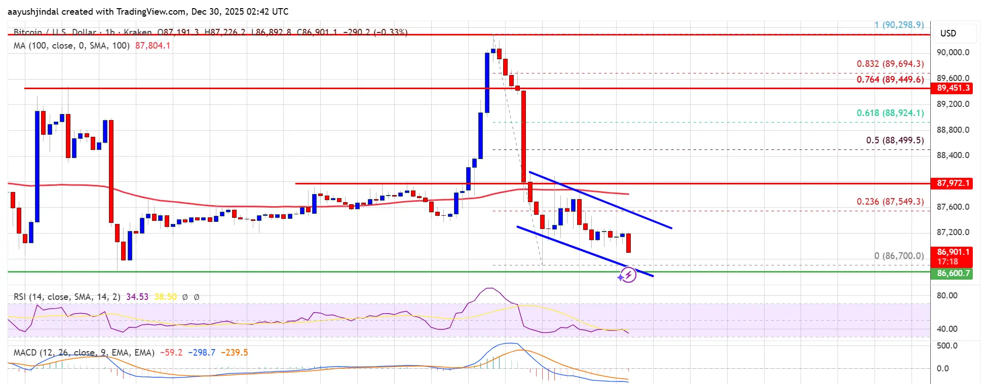 Le Bitcoin se négocie maintenant en dessous de 88 000 $ et de la moyenne mobile simple de 100 heures. Si le prix reste stable au-dessus de 86 500 $, il pourrait tenter une nouvelle vague de reprise. La résistance immédiate se situe près du niveau de 87 500 $. Un canal en déclin se forme avec une résistance à 87 500 $ sur le graphique horaire de la paire BTC/USD.