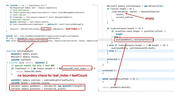 Mais VerifyProof) ne vérifie que si root == CalculateRoot(, leaves, mmrSize), sans s’assurer que chaque leaf.index est dans la plage valide (leaf.index < leafCount). En choisissant leafCount=1 et leaf_index=1, l’attaquant fait en sorte que CalculateRoot() saute la validation de la demande falsifiée, et retourne directement le root attendu. Cela brise le lien entre le message et la preuve, permettant à tout payload de passer sous le nom d’un état historique légitime.