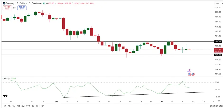 Harga Solana (SOL) terus berada di kisaran sempit selama hampir sebulan, mulai dari $125 hingga $145 sejak pertengahan November. Baik pembeli maupun penjual belum mampu mendominasi secara signifikan, menyebabkan pasar jatuh ke dalam keadaan tarik ulur.