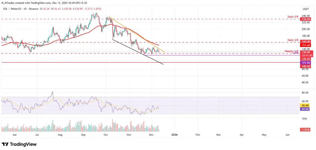 Biểu đồ SOL/USDT hàng ngày | Nguồn: TradaingViewTrên khung ngày, chỉ báo RSI đang ở mức 40 – thấp hơn ngưỡng trung tính 50 và vẫn dốc xuống – cho thấy động lượng giảm giá vẫn chiếm ưu thế.
