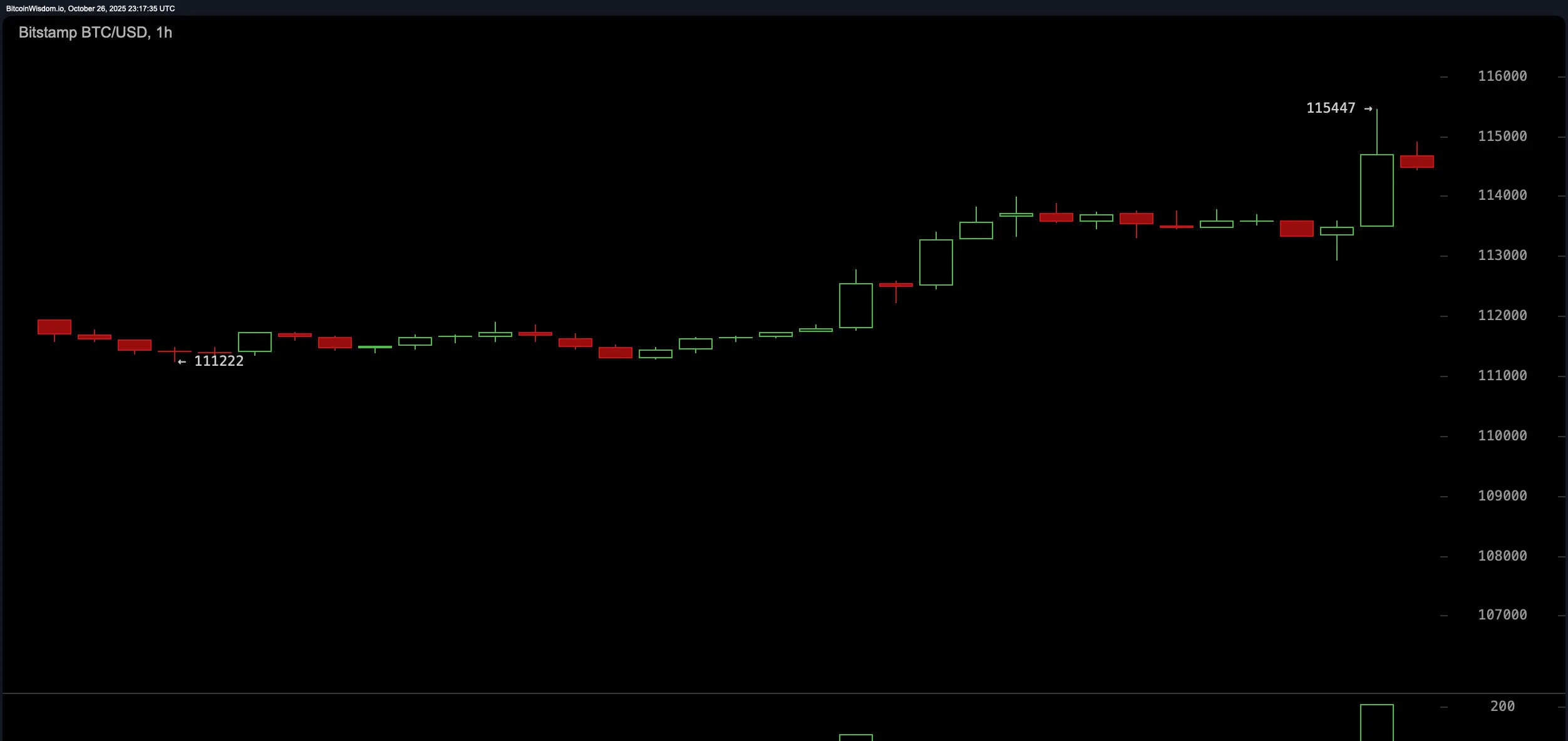 Sekitar pukul 6 sore waktu Timur pada 26 Oktober, BTC menerangi grafik per jam dengan lonjakan tajam ke $115,447 di suatu bursa. Harga telah sedikit mendingin, kini berada di $114,476 — masih 5,1% lebih tinggi daripada minggu lalu.