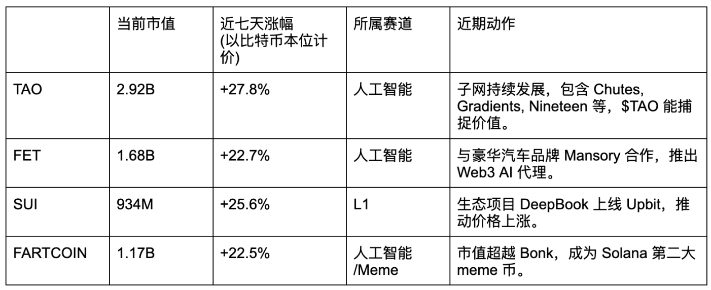 上述のトークンからレースの交差点を見つけると、重点的に注目するのは:AI、L1、Meme、そしてDeFiです。