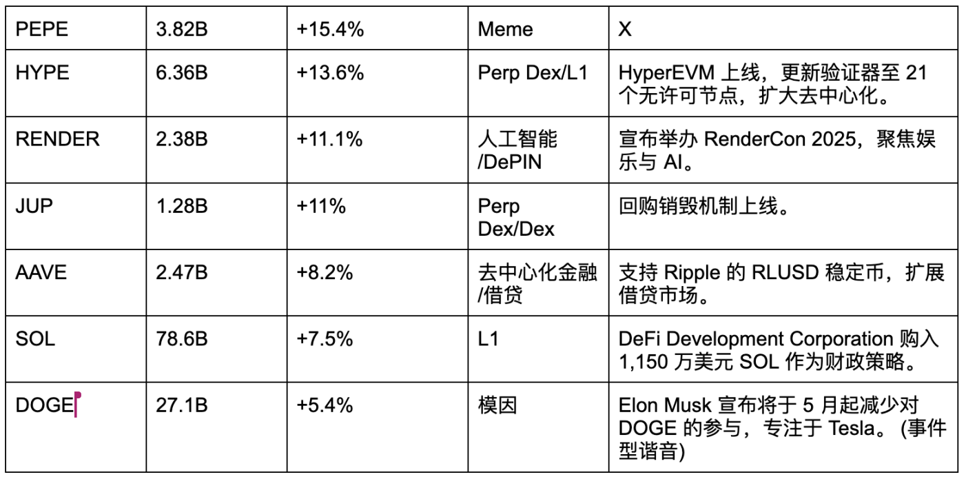下表は時価総額上位100のトークンを整理したものであり、過去7日間の動きがBTCを上回った通貨です。実際、下記の11のトークンだけではなく、4月23日にビットコインが大幅に上昇した際に、ビットコインの市場占有率がわずかに下落(0.2%)したことを示しています。これはアルトコインが全体的に上昇したことを意味し、多くの長い間下落していた通貨が、一夜にしてビットコインの7日間の上昇幅を超えました。しかし、この上昇は流動性の外溢れとして解釈されるべきであり、資金選択の結果ではありません。