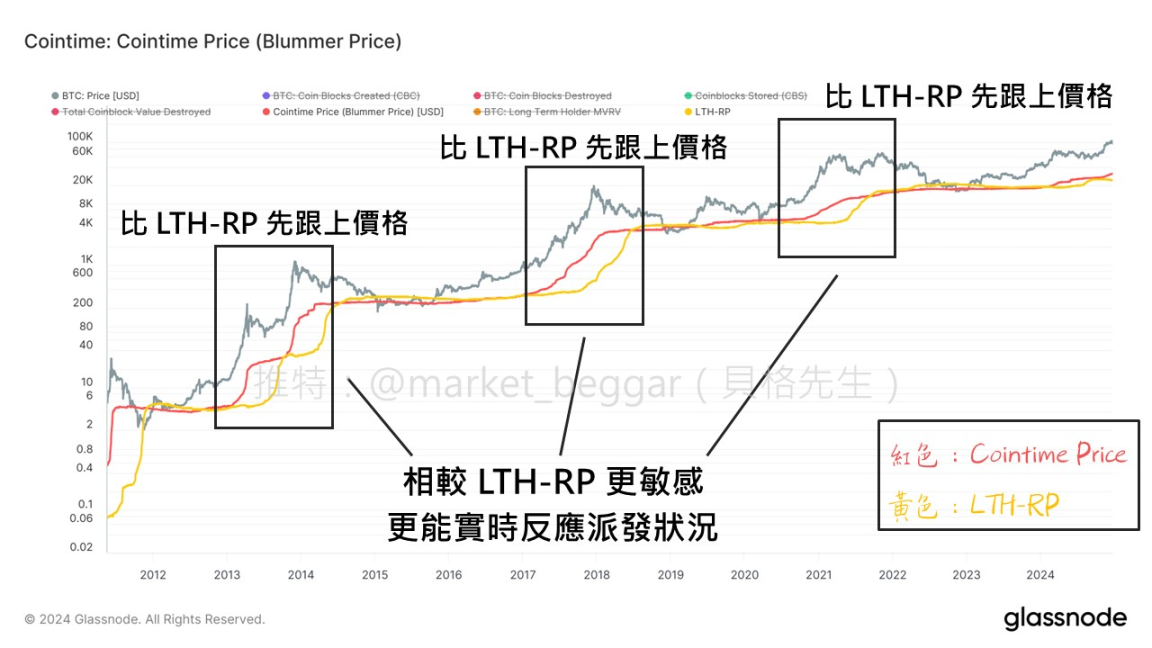 Cointime Price は「移転行動が発生した時、そのコインがどれくらいの期間保有されていたか」を直接考慮しているため、LTH-RP に対して、Cointime Price のパフォーマンスはより正確で敏感です。