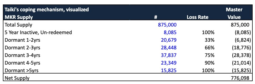 私は合理的な仮定に基づいています。たとえば、「過去4~5年間に23,349枚のMKRトークンが一度も移転されなかった場合、約90%が永久に失われ、つまり焼却されると仮定できます。」これらの仮定に基づいて、約10万枚のMKRが移転により焼却されると予想しています(流通供給量の約11.4%)。他の失われたトークンの事例(Aragon DAOなど)を参考にすると、これは保守的な推定だと考えています。