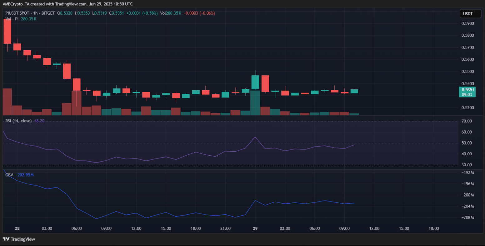この記事執筆時点で、PIの取引価格は約0.5351ドルで、上昇幅はそれほど大きくなく、重大なネットワークイベント後に通常見られる強い勢いは示されていません。