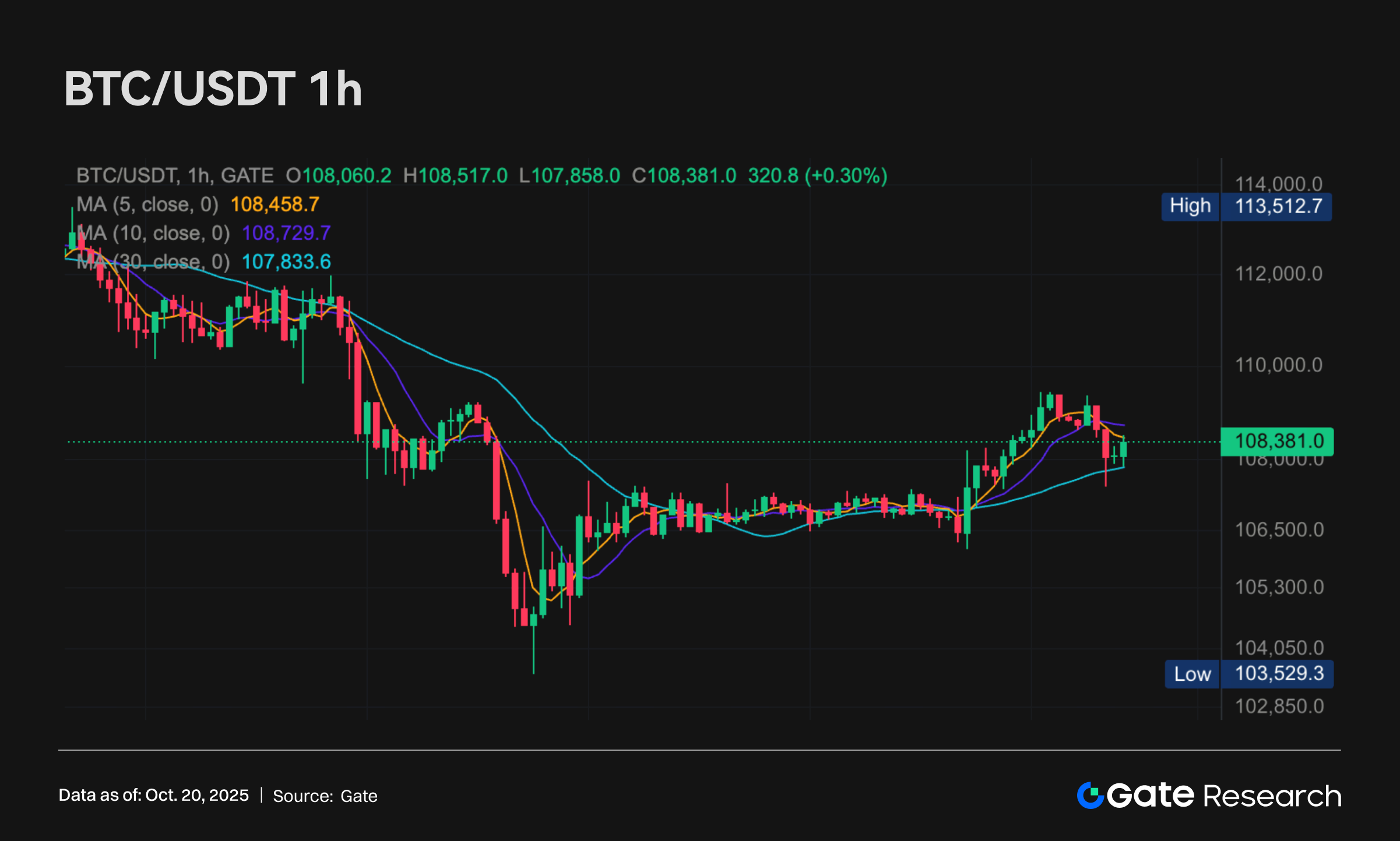 BTCの価格は10月17日付近の大幅な下落を経て、103,500ドル付近で段階的なサポートを得て、その後反発に転じました。短期移動平均線(MA5、MA10)は10月19日にゴールデンクロスを実現し、価格は108,000ドルを突破しましたが、108,500–109,000ドルの区域では一定の売圧に直面しました。