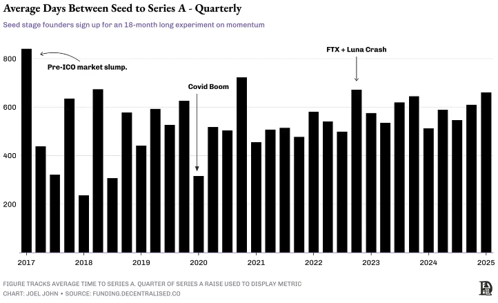 **6年間、私はこれらのデータを追跡してきましたが、同じ結論に達しています:リスク資金調達はますます困難になるでしょう。**市場の熱狂は最初、才能と利用可能な資本を引き付けるのが容易でしたが、市場の効率性が時間の経過とともに物事がますます困難になることを決定します。2018年には「ブロックチェーン」であることが資金調達につながりましたが、2025年にはプロジェクトの収益性と製品と市場の適合性に焦点を当て始めます。
