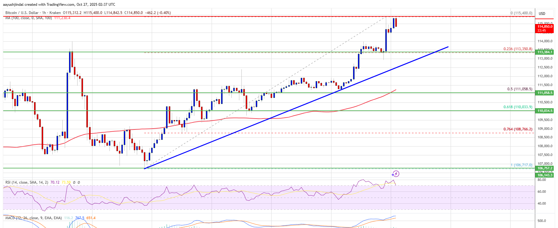 ブルは価格を$113,500以上、100時間単純移動平均を上回るように押し上げることができました。最終的に、価格は$115,000を超えて急騰し、現在は$106,718のスイングローから$115,400の高値までの最近の波の23.6%フィボナッチリトレースメントレベル以上で利益を固めています。