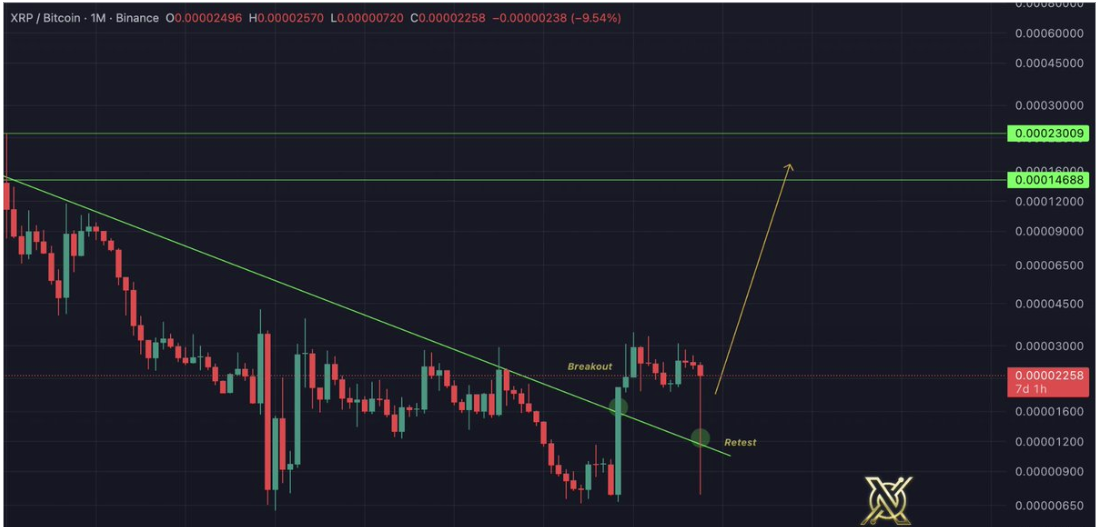 XRP/BTCが6年ぶりのブレイクアウトトレンドラインを再テスト、アナリストがデカップリングを呼びかける