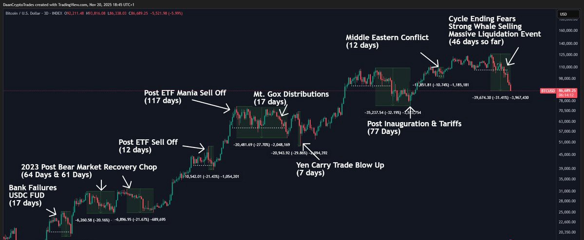 市場は珍しい圧力ポイントの合流に対処しています。ビットコインはマクロのローテーション、強い株式パフォーマンス、そして持続的な大口の分配に打撃を受けており、これはDaanCryptoの過去のドローダウンマップに見られる組み合わせであり、過去の地政学的ショック、ETFマニア、銀行の失敗、そして分配に関連したドロップがそれぞれ鋭いが孤立した減少を刻んでいます。
