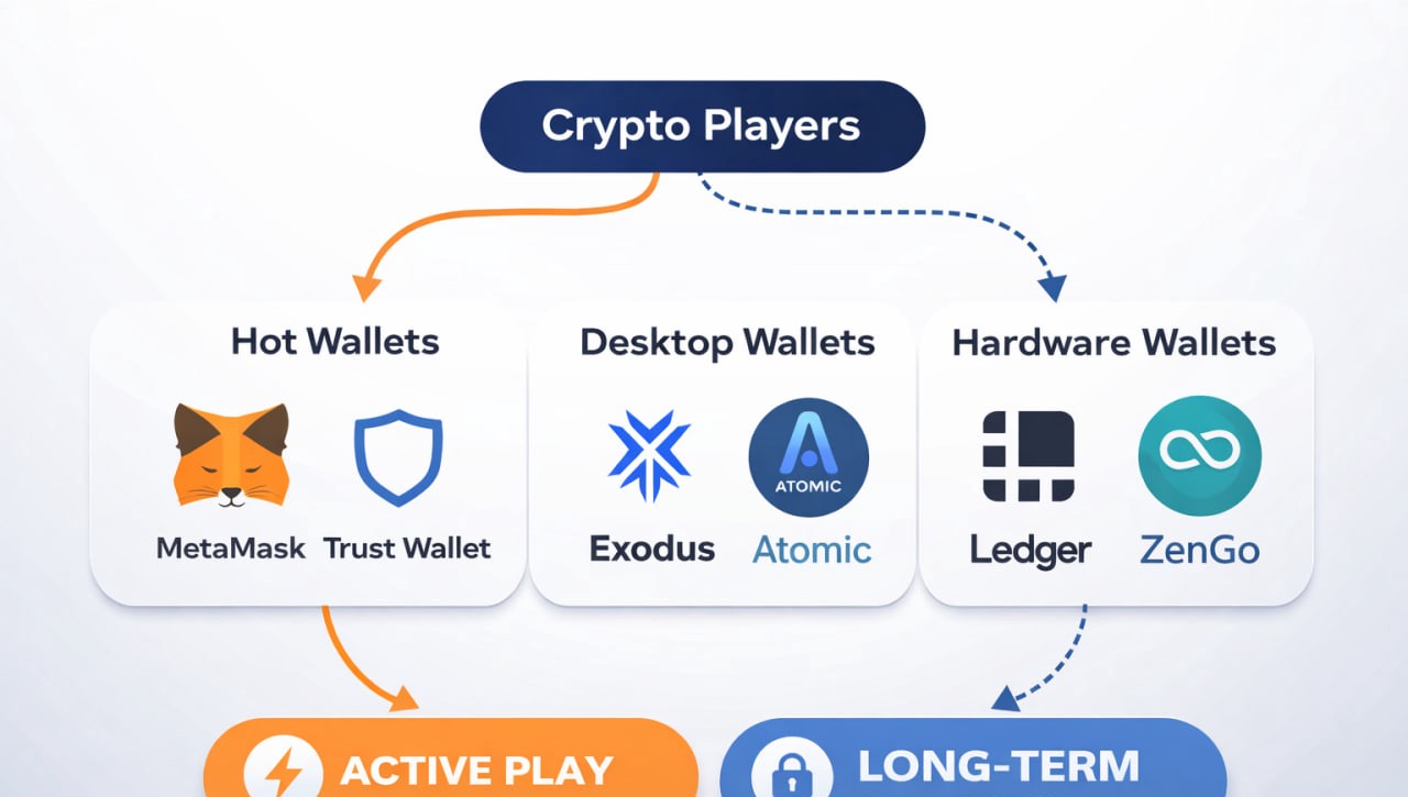 MetaMaskやTrust Walletのようなホットウォレットは、速度と接続の容易さからアクティブなプレイに一般的に使われます。これらは便利ですが、リスクも高まります。Exodusは、そのクリーンなインターフェースと複数デバイス対応のため、新規ユーザーにしばしば推奨され、一般的な用途にも適しています。