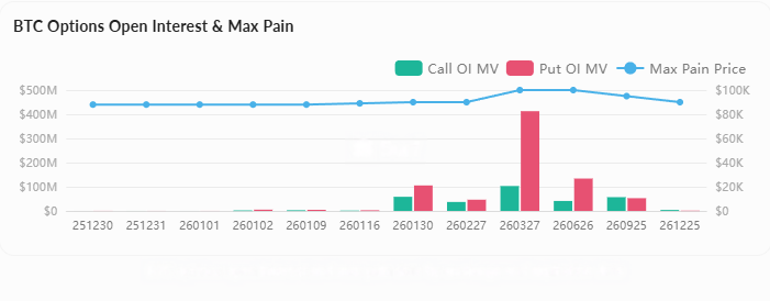 オプション市場:総ポジション$264億、複数満期日の最大痛点は**$88,000**に集中し、短期的な抵抗レベルとして作用。