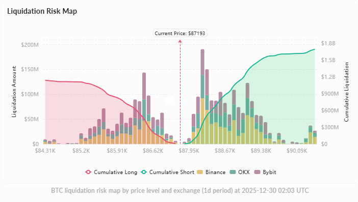 清算リスクマップ:$86,000-$87,000の範囲で買い手の清算超過$5億、下落連鎖清算リスクが顕著。上方$88,000超で売り手の清算$16億($90,000まで)を蓄積し、非対称の下落瀑布リスクを形成。