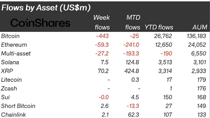 一方、ビットコインとイーサリアムは引き続き地歩を失っている。ビットコイン製品は$443 百万ドルの週間流出を記録し、イーサリアムは5950万ドルを失った。XRPとSolanaのETFローンチ以降、ビットコインとイーサリアムは合計28億ドルと16億ドルの流出を記録している。