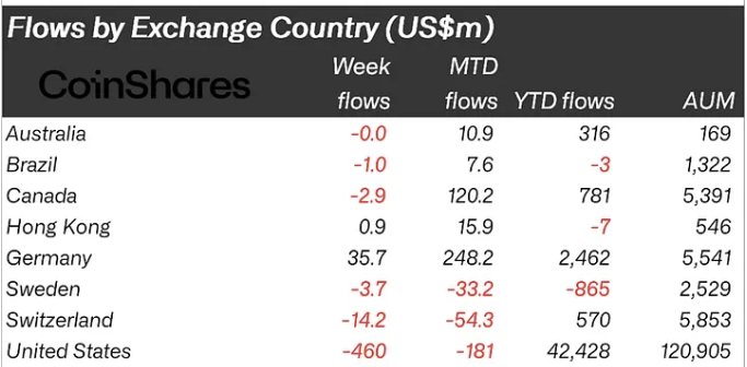 地域的には、売り圧力が広範囲にわたっていた。米国は最新の流出の大部分を占め、一週間で$460 百万ドルを売却した。スイスも控えめな引き出しを記録し、1420万ドルだった。これらの数字は、伝統的に支配的な暗号市場において投資家の慎重さが続いていることを示している。