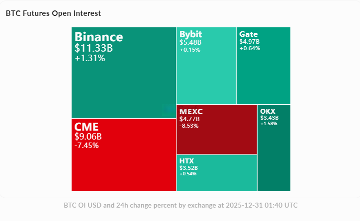 資金調達率: 主要取引所はプラスに転じ(Binance 0.0041%、Bybit/OKX 0.01%)、ロングペイショート、次の決済ラウンドは12月31日16:00頃に行われ、短期的な強気の意欲が回復していることを示しています