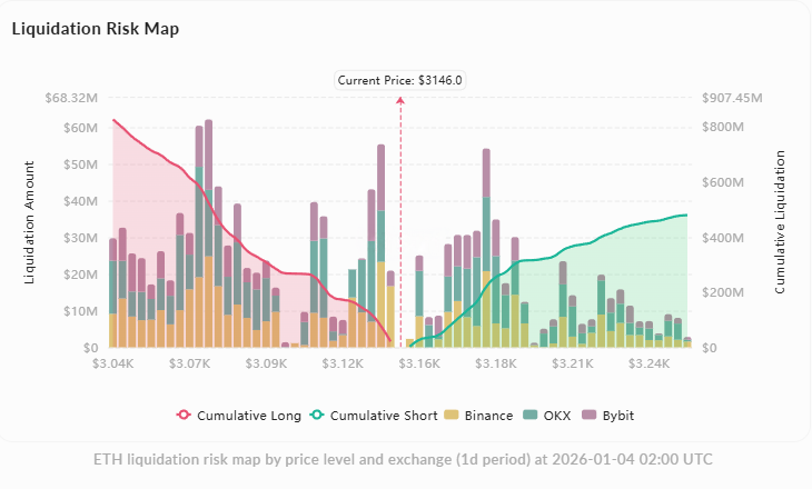 ## 核心观点**当前价格**:\$3,149(截至1月4日10:00)**短期展望**:技術面偏多,短期有望继续上探\$3,178-\$3,200区间。若守住\$3,114支撑,延续上涨概率65%;但4小时RSI已达75超买区,存在回调至\$3,100-\$3,077的技术修正风险。**关键支撑**:\$3,114(1小时布林中轨)、\$3,077(1小时布林下轨)、\$3,057(4小时布林中轨)**关键阻力**:\$3,178(4小时布林上轨)、\$3,250(日线SuperTrend)、\$3,152(空头清算密集区起点)---## 市场概况**价格表现*** 1月4日开盘\$3,130,盘中最高触及\$3,160,北京时间上午维持在\$3,149-\$3,158区间* 24小时涨幅+0.65%,延续1月3日以来的上升趋势* 市值\$3,798亿,稳居加密市场第二位**交易动态*** 1月3日净流入10,644 ETH(流入499,885 ETH,流出489,241 ETH),较前一日净流出状态转为流入* 交易所储备量16.62M ETH,较1月2日小幅增加,处于近期上升通道---## 技术面分析**多周期动量指标**| 周期 | RSI | MACD | 趋势强度(ADX) | 资金流(CMF) || ----- | ----------------- | ---------------- | --------------- | ----------------- || 1小时 | 69.76(接近超买) | 看涨(+3.05) | 38.5(强趋势) | +0.15(资金流入) || 4小时 | 75.02(超买) | 看涨(+6.00) | 40.5(强趋势) | +0.17(资金流入) || 日线 | 60.32(中性偏多) | 强看涨(+30.00) | 23.4(弱-中等) | -0.01(中性) |**关键技术位*** 价格位于1小时布林带上轨(\$3,151)附近,紧贴阻力运行* 短期均线呈多头排列:EMA12(\$3,129) > EMA26(\$3,115) > SMA50(\$3,094)* 中期4小时布林带显示价格在中轨(\$3,057)与上轨(\$3,178)之间运行* 日线尚未突破SMA200(\$3,602),长期仍处阻力位下方**图表形态*** 低周期图表呈上升通道,连续形成更高的高点和低点* 日线突破布林上轨(\$3,138),MACD金叉信号强烈---## 衍生品市场**期货持仓*** 总持仓量\$417亿,24小时-0.52%* 资金费率分化:币安+0.0065%(多头支付),Gate -0.0055%(空头支付)**期权市场*** 期权持仓量\$70.2亿,24小时-0.16%* 近期最大痛点:1月4日到期\$3,100,1月5-7日到期\$3,050**清算分布*** 24小时清算\$3,036万,其中空头清算\$2,294万 vs 多头清算\$743万,空头挤压明显* 清算密集区:下方\$3,040累计多头头寸\$8,250万(\$3,070-\$3,141区间集中);上方\$3,254累计空头头寸\$4,780万(从\$3,152开始)**衍生品信号解读*** 空头清算占比达75.5%,支撑看涨情绪* 清算带与技术位高度吻合,\$3,114-\$3,141为多头防守区,\$3,152-\$3,178为空头压力区-------------------------------------------------------------------------------------------------## コミュニティの感情**価格議論の焦点*** コミュニティは1月初旬の重要抵抗線突破に注目、短期下降チャネル突破後の上昇圧力形成* アナリストは構造パターンが他資産と類似と指摘、調整後の継続推進を予測* 長期高値目標が繰り返し引用され、短期の楽観的見通しに影響**ファンダメンタルズのストーリー*** イーサリアムネットワークの取引活動増加はネットワーク回復のポジティブサイン* 今後のスケーリングアップグレードやステート管理最適化によりコミュニティの信頼向上* DeFiの支配、機関のステーブルコイン採用、実世界資産のトークン化が2026年のコア優位性として強調**KOLの見解*** 取引アカウントは取引量回復にはカタリストが必要と指摘、上昇継続の条件は重要エリアの維持と明示* チャートアナリストは具体的な支援・抵抗レベルを明示し、さらなる上昇条件は重要ゾーンの維持と設定* 創始者のビジョンは分散型インフラの構築に焦点を当て、市場のイーサリアム競争力認識に影響---## まとめ技術面とデリバティブデータは明らかに強気優位:1時間と4時間のADXは堅調なトレンドを示し、資金流指標は継続的に流入、空頭清算比率は75.5%で絞り込み効果を生む。価格は布林上轨に密着し、短期移動平均線は多頭排列を維持。ただし、4時間RSIが75の超買状態にあることと、日足が長期SMA200(\$3,602)を突破していない構造的抵抗に注意。価格が\$3,114以下に下落した場合、\$3,077-\$3,100への技術的修正が起こる可能性。逆に\$3,178を守り突破できれば、\$3,200-\$3,250の上昇余地が開かれる。コミュニティの感情は前向きで、ネットワーク活動の回復とプロトコルアップグレードの期待がファンダメンタルズを支える。\$3,114の支援と\$3,178の抵抗突破の確認を注視すべき。